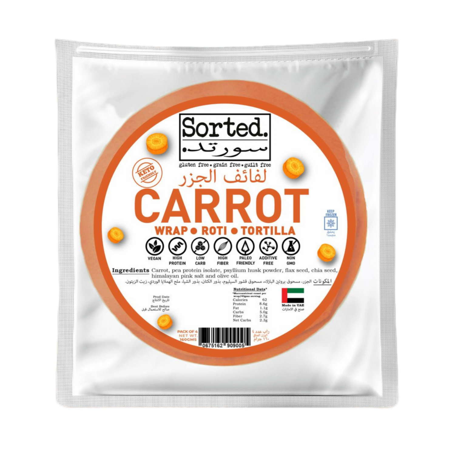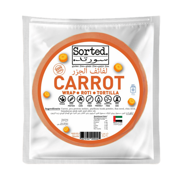 Sorted Carrot Wrap with Pea Protein to sort out your nutrition and weight loss needs together.8.6gms Protein, 62 Calories and only 2.3gms Net carbs! High on Protein, Fibre and Vitamins, Low on Carbs and Calories, this is your main tool to boost your nutrition.