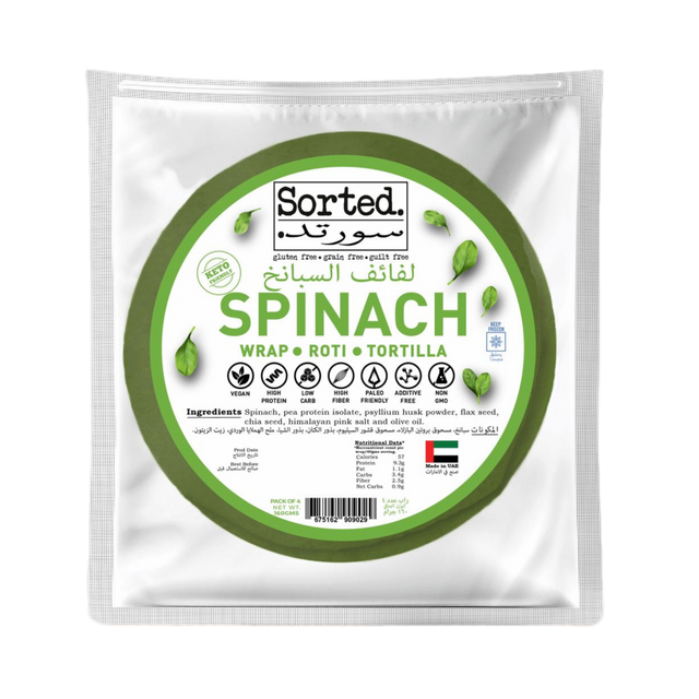 Sorted Spinach Wrap with Pea Protein – 9.3gms Protein, 57 Calories and Only 0.9gms Net Carbs | Add Greens to your diet! | A Gluten Free, Grain Free and Guilt Free Wrap to add to your diet with 9gms of Plant based Protein in every wrap.